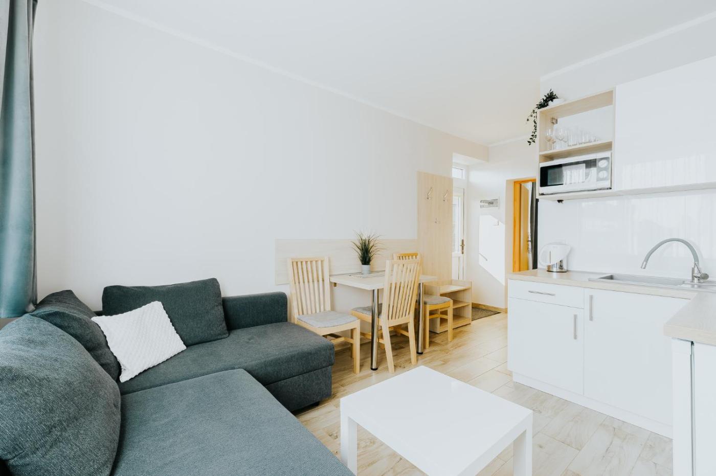 Apartament typu Deluxe Suite. Featuring a private entrance, this suite comprises 1 living room, 1 separate bedroom and 1 bathroom with a shower and a hairdryer. Guests will find a stovetop, a refrigerator, kitchenware and a microwave in the fully equipped kitchen. The suite also provides guests with a barbecue. The suite features tiled floors, a seating area with a flat-screen TV, a dining area, a wardrobe as well as garden views. The unit offers 3 beds. Apartament typu Suite - 4 osobowy. Powierzchnia pokoju ok.: 30 mkw. ;