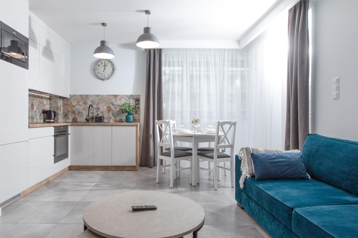 Oferta apartamentu obejmuje sypialnię (1), salon, aneks kuchenny z pełnym wyposażeniem, w tym lodówką i ekspresem do kawy, a także łazienkę (1) z prysznicem oraz suszarką do włosów. W apartamencie zapewniono ręczniki i pościel.